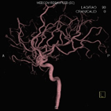この装置では、脳神経外科が頸部より上の動脈や静脈の撮影と治療、消化器内科が肝臓がんの撮影と治療、移植外科が透析患者様のシャントの撮影と治療を行っています。ひとつの写真に収まる範囲がとても広いため、特に頭部や腹部を撮影することに適している装置です。また、血管を立体的に表示する3D画像の撮影も行うことが出来ます。